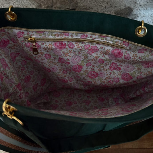 choisissez le tissu extérieur en suédine , le tissu intérieur issu des authentiques cotons Liberty of London et le coloris de la bandoulière .