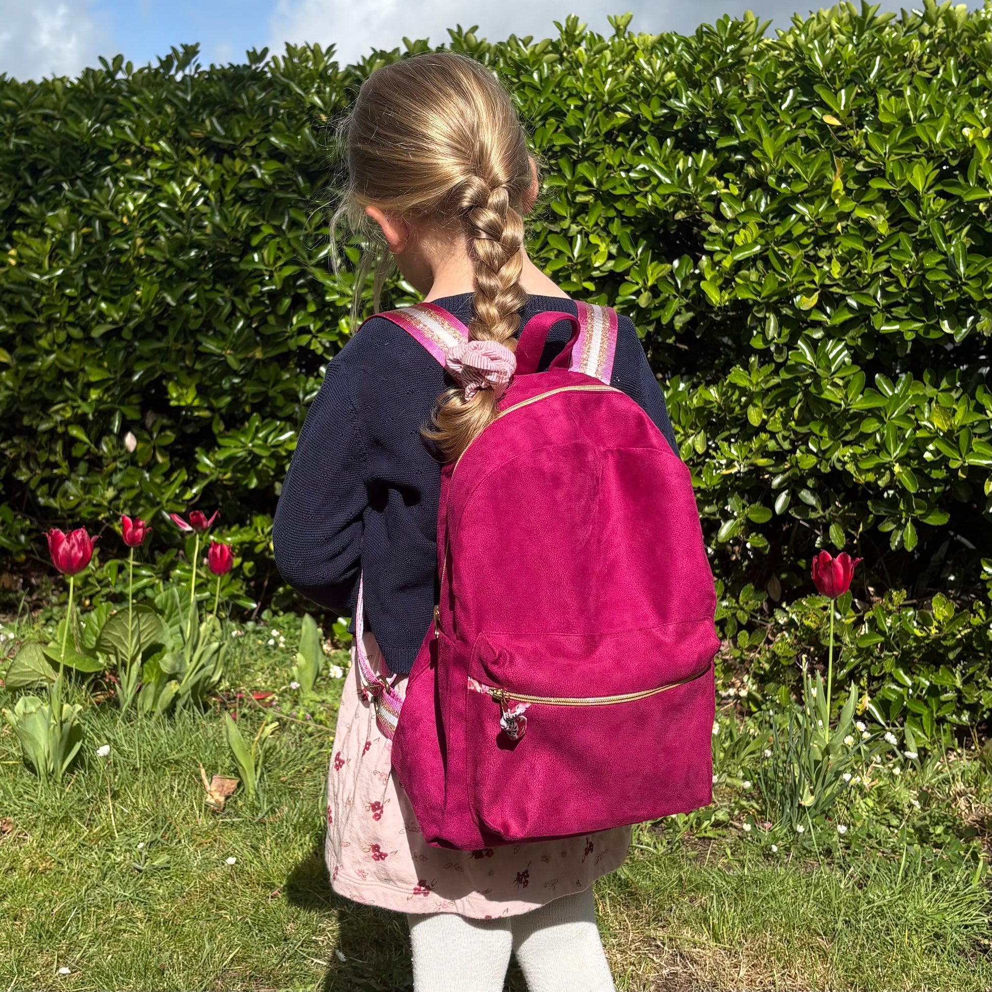 Ce mini sac à dos convient aussi bien aux enfants qu’aux adultes recherchant un format compact. (Porté ici par une enfant pour vous donner une idée de la taille.)